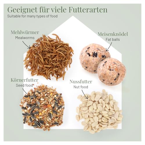 HYGIENISCH & FRISCH – Die einzelnen Elemente der Futterstation sind stabil verschraubt und fixiert. Das engmaschige Gitter der Futterschale optimiert die Luftzirkulation, so dass Vogelfutter länger haltbar bleibt