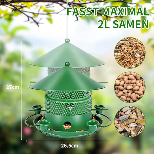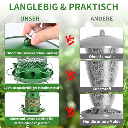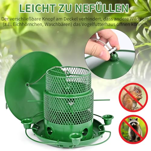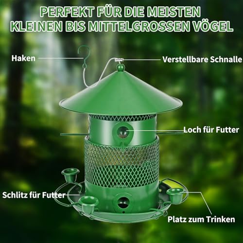 🎁【Beste Geschenkidee】Der grüne Futterspender wird mit einem Futtertrog, vielen Futterlöchern und 4 Trinköffnungen geliefert und ist ideal, um die meisten kleinen bis mittelgroßen Vögel bei jedem Wetter zu füttern. Er ist auch ein schönes Geschenk für jemanden, der auch ein Naturliebhaber ist, zum Geburtstag oder zu einem anderen besonderen Anlass.